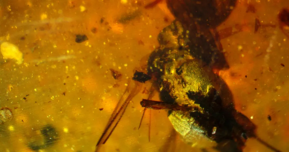 Jantar obsahuje: Žlutohnědý jantar průhledný, zabarvený pilovými inkluzemi, hmyz - nebo jejich části v počtu 3 kusů, blanokřídlí (Hymenoptera Aculeata), hlava larvy 2 x, části vegetace, hmyzí trus.