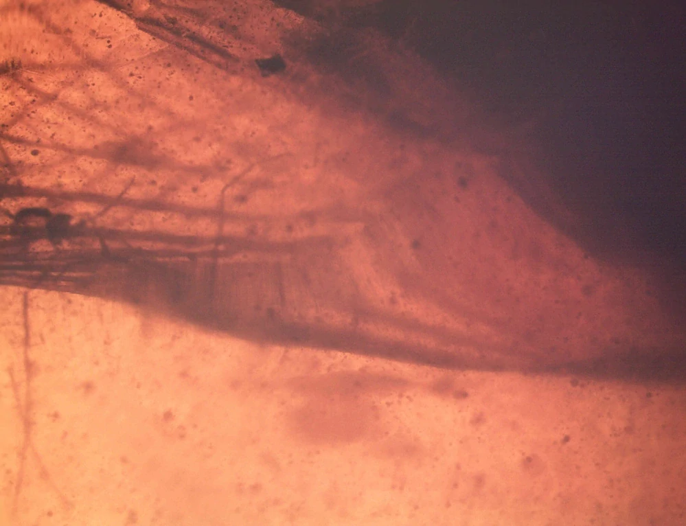 V okolí některých organických inkluzí je pozorovatelný jemný světelný lem vznikající rozdílným lomem světla mezi pryskyřicí a biologickým materiálem, který se projevuje jako přirozený optický jev související s mikrostrukturou rozhraní a potvrzuje autentické zapouzdření organismů během tuhnutí pryskyřice bez známek sekundárního zásahu nebo umělého zvýraznění.